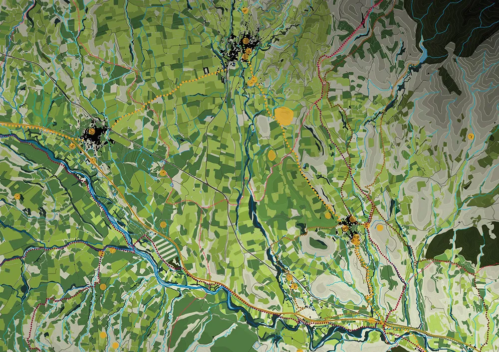 La primera nace al hilo de que todas las localidades deben de formar parte de una estructura verde territorial. La continuidad biológica se pierde al llegar a los pueblos, dada su materialidad y morfología urbana; para que esto no suceda, planteamos continuar el paisaje integrándolo en los límites de cada localidad con un anillo verde.