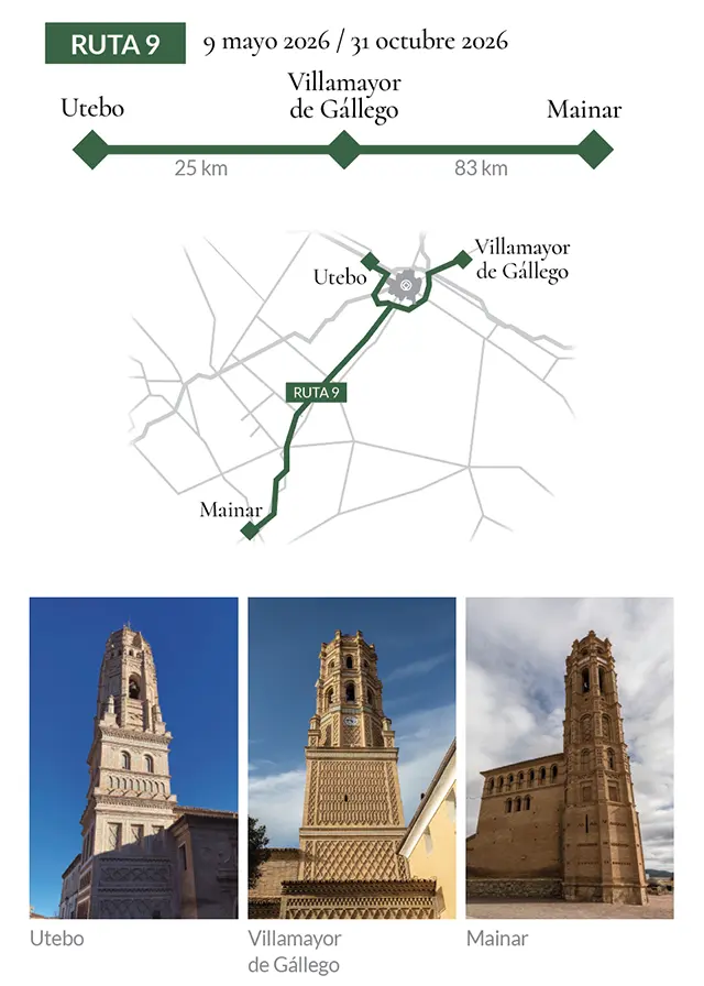 10.00 h. Utebo. La conocida torre de los Espejos, en la iglesia de Nuestra Señora de la Asunción, marca el inicio del recorrido. La visita al interior del templo y el ascenso a la torre permiten apreciar uno de los ejemplos más emblemáticos del mudéjar zaragozano.